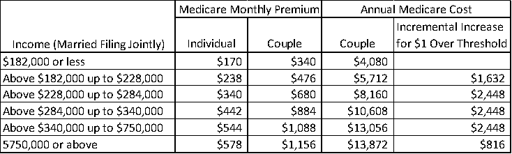 The cost of Medicare Premiums goes up for high-income earners, as shown in Table #3. Crossing over an income bracket by even $1 raises your monthly premium to the next level for both you and your spouse if both are on Medicare. The table shows that annual Medicare Premiums for a couple can increase by $2,448 if their income crosses $1 into the next income bracket. High-income earners may pay two to three times the base cost. Another important point is that the income is based on your modified adjusted income from two years ago when a retiree may still have been working and not based on your current lower retirement income.