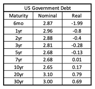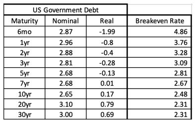 Table of similar maturities Yields of US Government Debt for both Nominal Bonds and TIPS:
