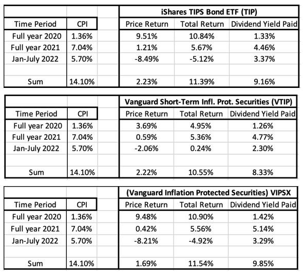 I have chosen 3 Representative TIPS ETF and Mutual Funds. I have highlighted the CPI accumulated each year for 2020, 2021, and YTD 2022. I have also highlighted the difference in Total less Price Returns for each year for these funds. The hope is that the CPI should over time match the Dividends paid. The relationship has broken down after 2020.