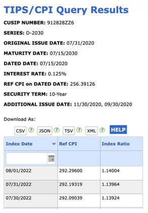 The Treasury Department maintains a webpage with the Issue details and Index Ratios for every single TIP issued. Here are the Index Ratios for Lucille for every single day since the bond was issued. I’ve zoomed into the file to look at the July 31, 2022 Reference CPI.