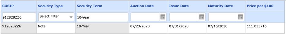 We knew the Interest Rate (coupon) was 0.125%. For the Face Value Price of $100, the Issue price was ~$111. Using price and coupon, we calculate the Real Yield. It was -0.9% at auction time. Investors were willing to receive the CPI minus 0.9%, from the US Government for the next 10 years at auction time. They did so by paying $111 for a $100 10-yr TIPS bond.