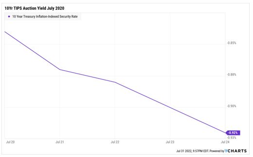 Duration Risk says that the longer a bond’s maturity date, the more sensitive the bond is to changes in market yields. Yields go up, Bond prices go down. Duration can roughly estimate the price change from changes in yield. When the yield is close to zero or negative, the Duration is high. A small change in yields causes a big change in price. A 10-year TIPS bond also had a duration of about 10 years. According to the WSJ TIPS Bond page, the Real Yield on the bond as of this Friday, July 31st, 2022, is +0.06%