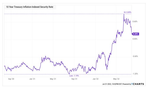 From a low of -1.2% in August 2021, TIPS yields rose to +0.89% in June 2022. Currently, the 10-year TIPS yield is +0.20%. This increase in Yields lowers the price of TIPS bonds.