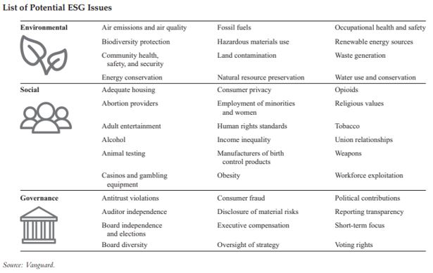 Environmental, Social, and Governance focused investing can mean different things to different people. Here is a graphic from Vanguard showing some areas that Vanguard feels come under these headings.