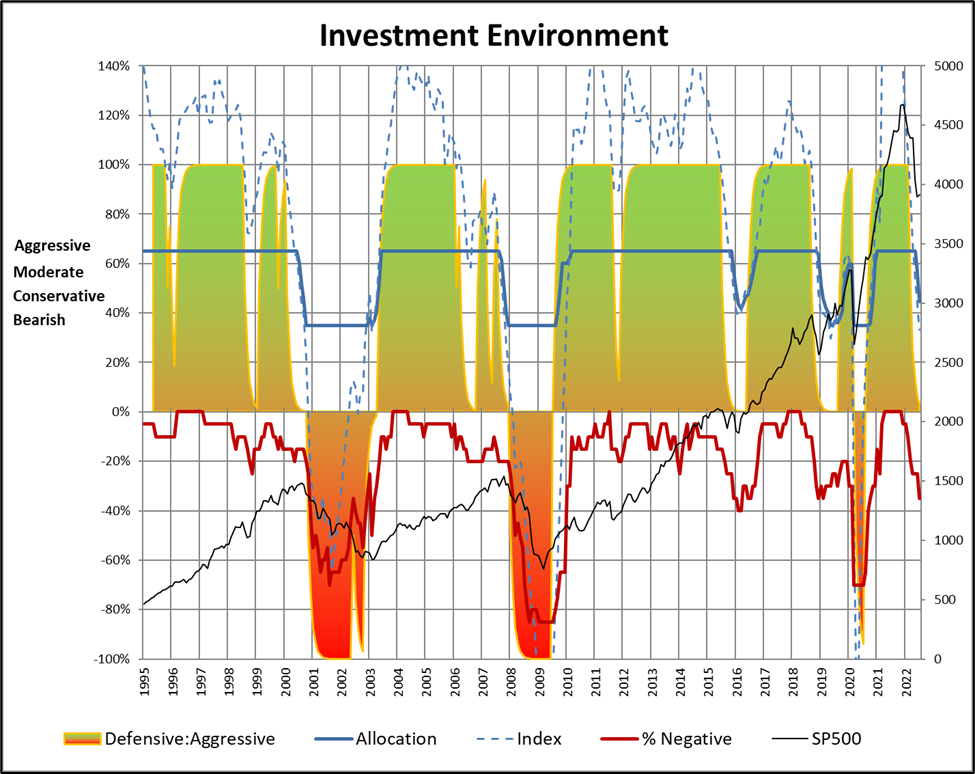 A worsening investment environment is no surprise as my Investment Model continues to deteriorate rapidly, as shown in Figure #2. My neutral allocation to stocks is 50%, with a minimum of 35% and a maximum of 65%. The average allocation to stocks over the past 27 years has been 58%. The current allocation as of July is estimated at 45% stocks, and if the trend continues, will fall to my minimum allocation to stocks of 35% in August as data becomes available. Production, Services, and Labor Conditions are the strongest indicators and provide hope for a soft landing. Indicators that continue to be highly negative are Valuations, Inflation, Margin Debt, and Housing. Contributing to the decline in Investment Environment are Productivity, Eurozone, Consumer Confidence, Banking, Leading, Recession, Yield Curve, and Interest Rates. To a lesser extent, National (Coincident) Activity and Spending are decreasing the outlook. The Corporate Health and Orders indicators are beginning to show weakness. A recession in 2023 is becoming increasingly likely. The slowdown is broad-based (red line), with nearly forty percent of the indicators being negative.