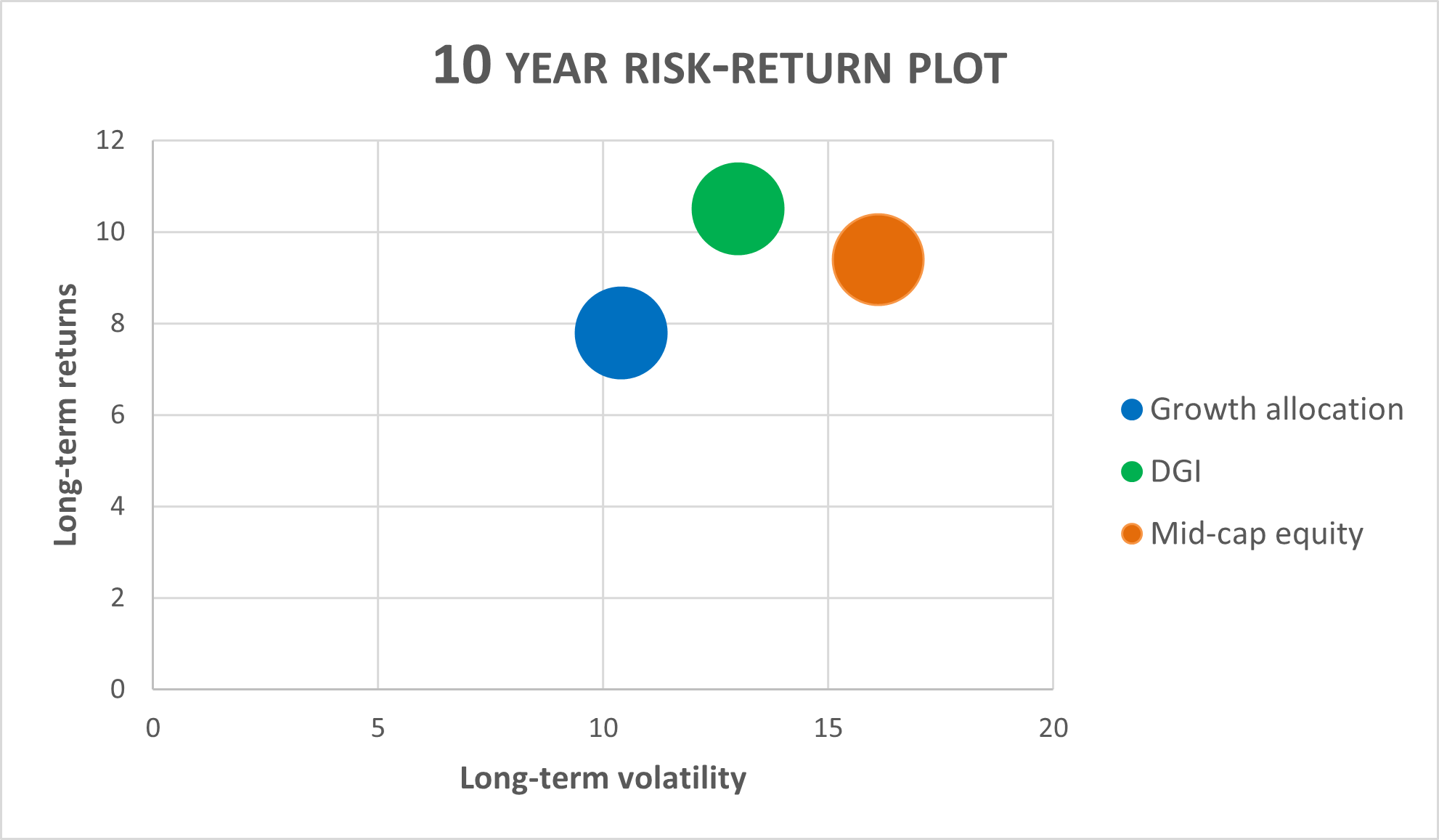 In our three risk measures – maximum drawdown, standard deviation (or “day-to-day volatility”), and downside (or “bad”) volatility – DGI is a bit more volatile than its large cap-heavy allocation funds and substantially less volatile than a peer mid-cap equity fund.