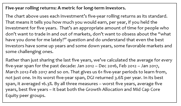 That’s a massive distinction with serious implications for the reliability of peer group comparisons. DGI is more volatile than almost all of its Growth Allocation peers but less volatile and — measured by its average five-year performance – more profitable than a pure mid-cap equity portfolio.