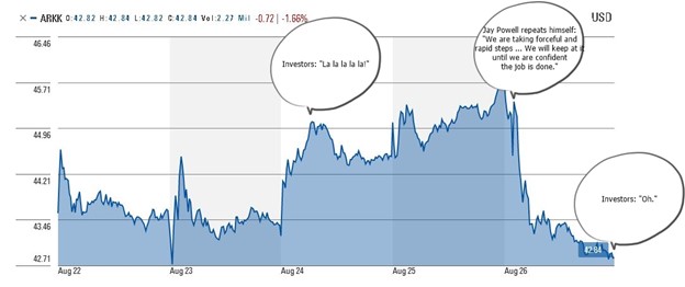 On Friday, August 26 at 10:00 a.m. EDT, Fed chair Jay Powell said exactly (a) what he’d been saying for months and (b) what investors knew he was going to say. One of the mavens at Wells Fargo confidently predicted: