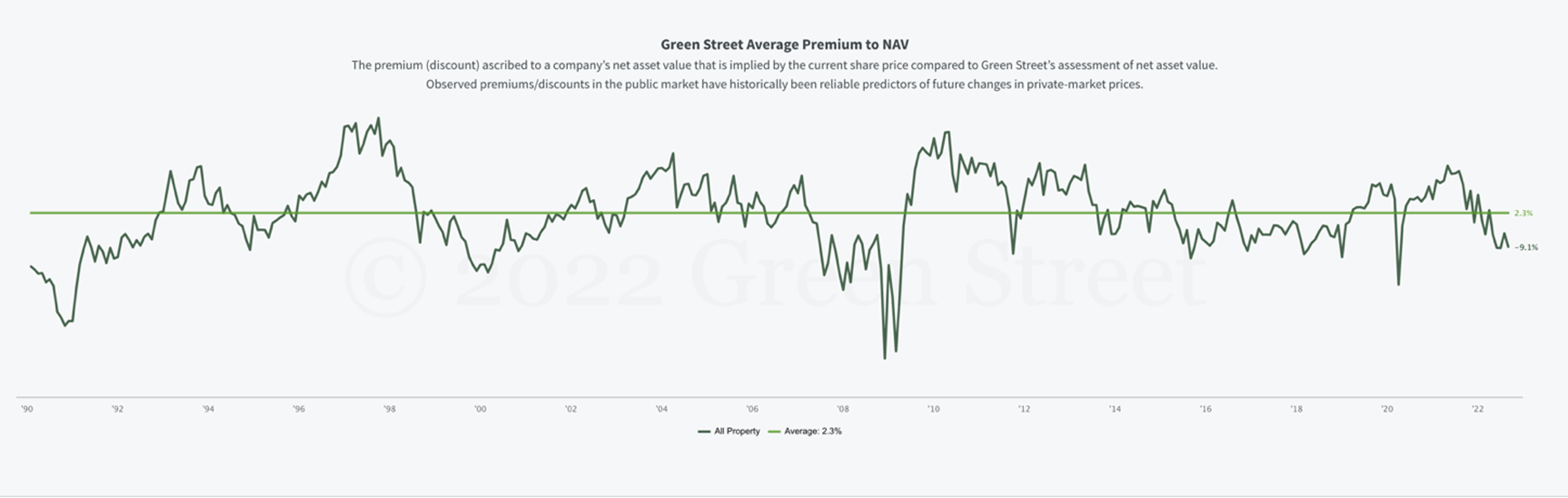 Green Street Advisor is the preeminent independent research and advisory firm concentrating on the commercial real estate industry in North America and Europe. The firm maintains a measure of Public REITs Share Prices to Green Street calculated NAVs going back to 1990.