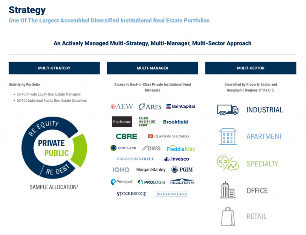 They are funds of funds. These funds are investors in institutional Private Real Estate funds. They may also invest in public REITs, public REIT ETFs, and the debt of REITs. They belong in the US Domestic Real Estate investment bucket. By picking best-in-class real estate managers and their funds in their portfolio, these closed-end funds hope to earn income and gain capital appreciation.