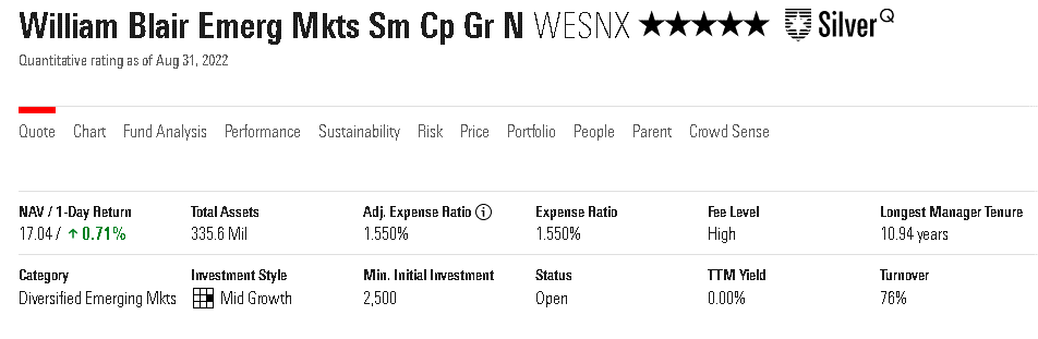 The fund’s AUM has fallen but by a relatively small amount. The latest William Blair report on four- and five-star funds says that closed funds are flagged with an asterisk (*). WESNX is not flagged.