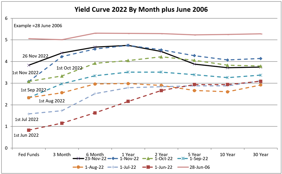 The chart below shows that the current yield curve, as of November 26th, has remained high for durations less than two years and fallen significantly for longer durations compared to November 1st. Short-term rates will rise, and longer-term rates are likely to invert further.