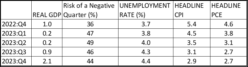 I consolidated the outlook from the Federal Reserve Bank of Philadelphia’s Fourth Quarter 2022 Survey of Professional Forecasters based on thirty-eight forecasters surveyed. The outlook is for slow growth during the first three quarters of next year with a high risk of a negative quarter. Unemployment is expected to rise modestly and inflation to fall to three percent by the end of the year.
