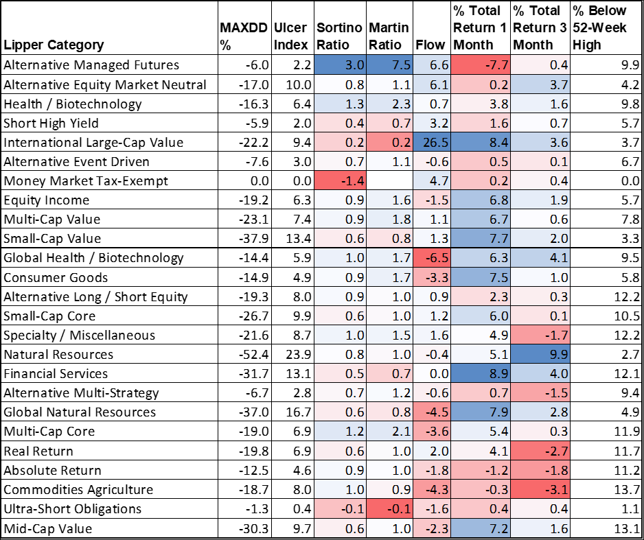 I track nearly three hundred funds in over one hundred Lipper Categories using MFO Premium’s MultiSearch. I rank these funds based on Momentum, Risk, Risk Adjusted long-term Return, short-term returns, and Money Flow. The top-rated Lipper Categories are shown below. Average metrics are shown based on three-year performance. Monthly returns and percent below the 52-week high are from Morningstar. At this point, I am not adding to equities, and I am seeking to extend bond durations.