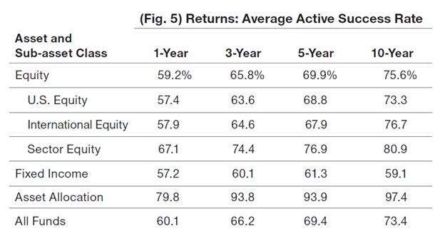Translation: if you hold the average T Rowe Price equity fund for five years, you have about a 70% chance of beating the market: which is to say, outperforming a passive index fund or ETF in the same investment arena. A second table in the same report tracks “the percentage of funds that outperform more than half the time (those with a “positive” active success rate”).” That’s 80% of all T. Rowe Price funds, including 100% of its asset allocation (e.g., target-date) funds.