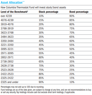 I maintain allocations to the Columbia Thermostat Fund (Morningstar links: CTFAX / COTZX). As of November, it had an allocation to stocks of about 20%. Its current strategy to allocate between stocks and bonds is shown in the following table. If the S&P500 ends 2023 between 3,500 and 4,000, the fund will have between 20% and 35% allocated to stocks. In the event of a severe bear market, Threadneedle may allocate more than 75% to equities.