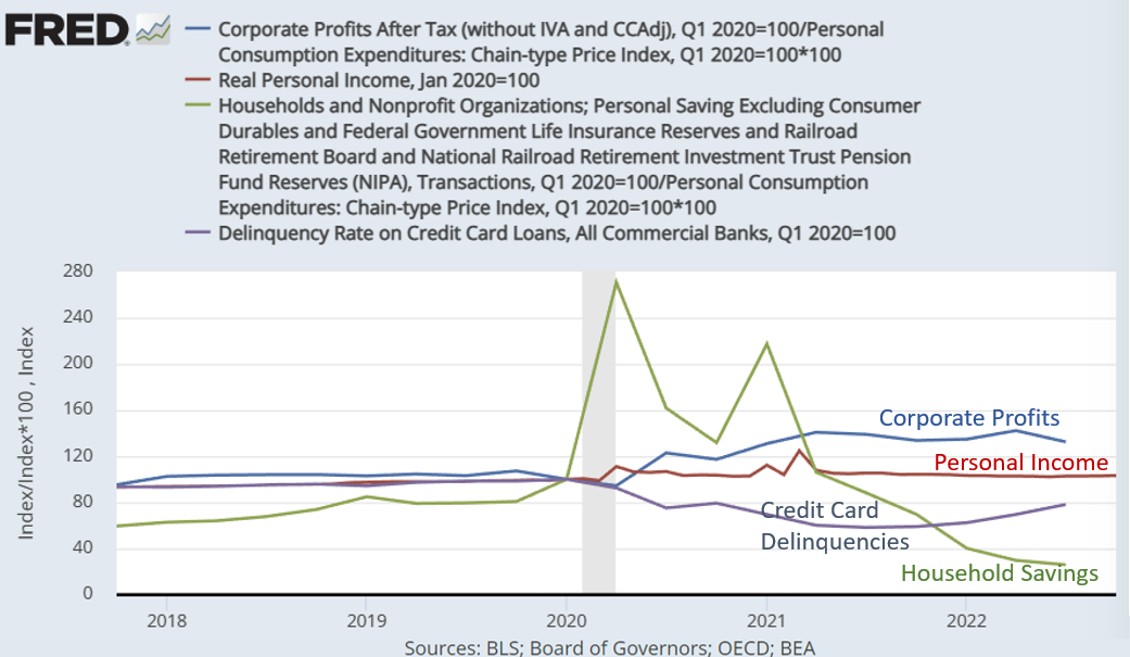 The following figure shows real (inflation-adjusted 2020 Q1=100) Corporate Profits After Taxes (blue line) are trending lower. Real Personal Income (red line) is not keeping up with inflation. Real Personal Savings (green line) has declined below the pre-pandemic level as consumers dip into savings and inflation takes a bite. Credit card delinquency (purple line) is on the rise. Risks created by the bursting of the credit bubble will not be fully realized until the recession is underway.