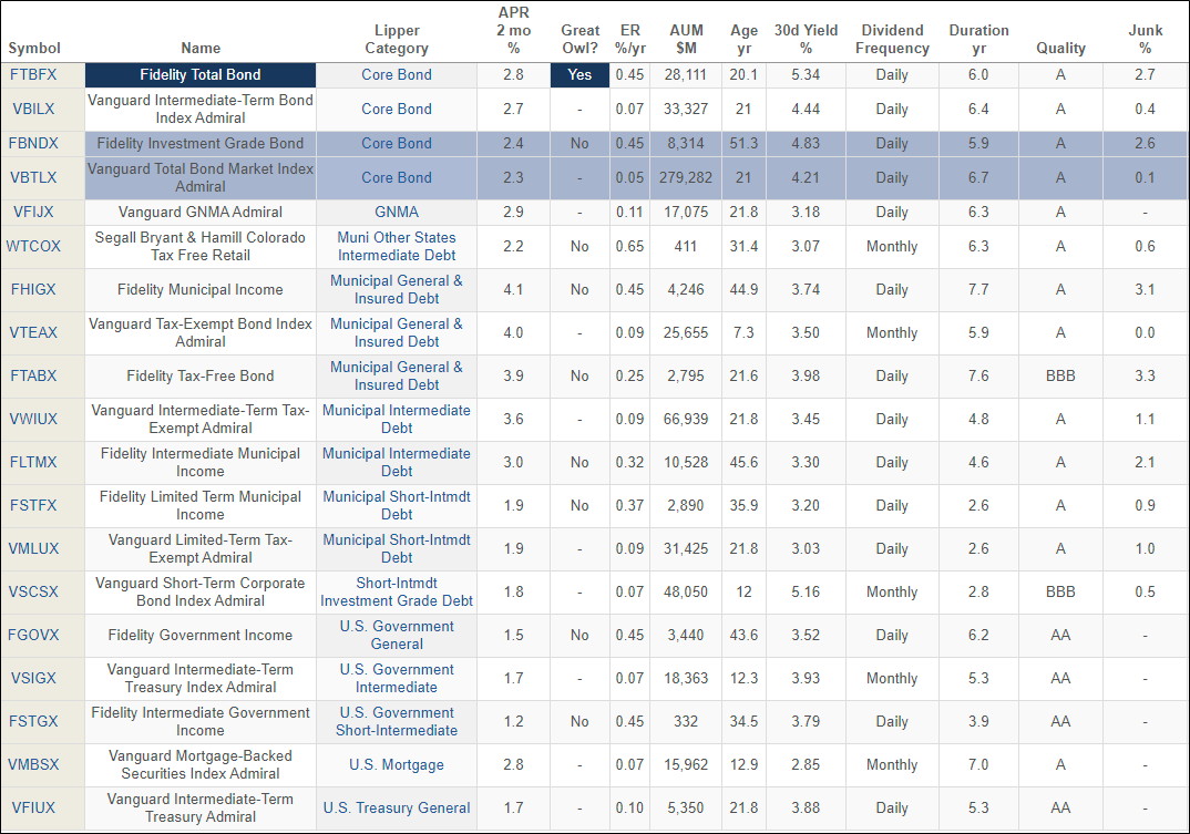 Table #1: Author’s Select List of Bond Funds for 2023