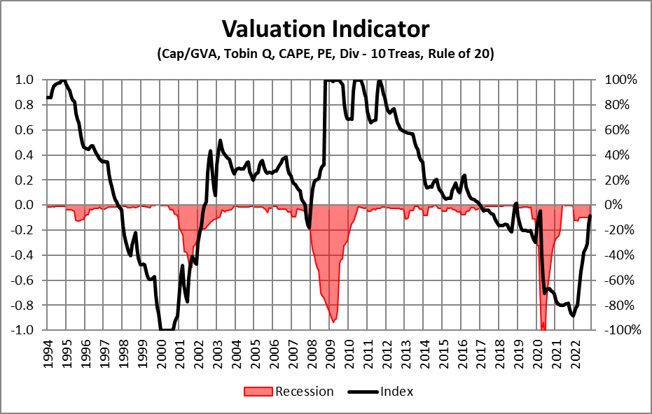Starting valuations are one of the determining factors of the severity of the bear market. Below is my composite of six valuation techniques where minus one is very unfavorable and positive one is very favorable. The bear market of 2022 brought equity valuations down, but they are still elevated for the current landscape. Valuations at the start of 2023 are no bargain.