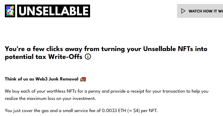 Here’s the problem: you can’t realize the loss unless there’s someone who will buy the scrap from you. Enter Unsellable, which is willing to offer you a penny for your NFT if you pay the … well, about 400 times that much to take it off your hands.