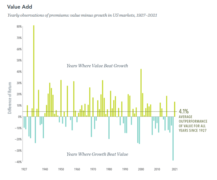 2022 saw a dramatic reversal. The Vanguard Value Index (VIVAX) dropped 2.5%, while its sibling Vanguard Growth Index (VIGRX) fell 34%. Their Small Cap Value Index Fund (VISVX) dropped 9.5%, while the Small Cap Growth Index Fund (VISGX) fell 29%. Value and growth tend to trade off market leadership, with one style easily capable of besting the other for five years or more. The chart below, from Dimensional Advisers, shows value outperformance both in the aggregate (about 400 bps since 1927) and annually (the yellow bars). In particular, you might note the pattern of the high inflation period of the 1970s and early 1980s.