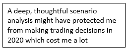A deep, thoughtful, in advance, scenario analysis might have protected me from making trading decisions that cost me a lot in taxes, if not in investment returns. I now do this kind of scenario analysis regularly across all my investments.