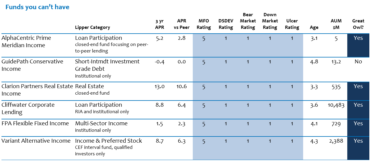 A handful of other funds also made the cut but appear to be unavailable to mere mortals, normal investors, and the folks I know. For the sake of the richly resourced, we wanted to include the restricted funds with some notes about their distinction.