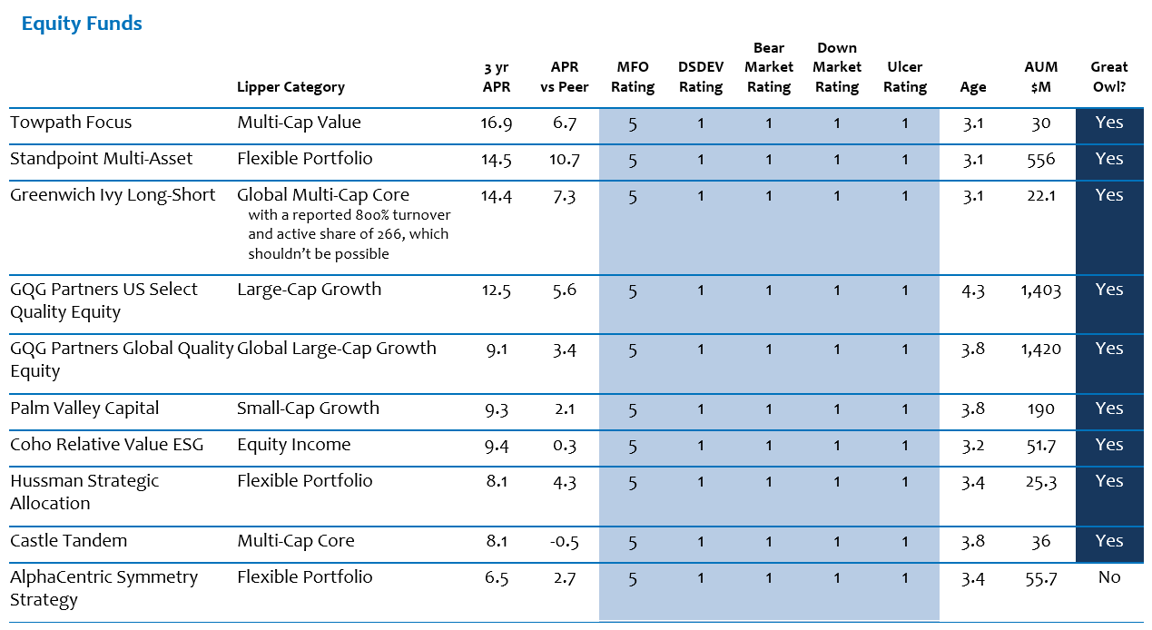 A handful of young funds, by luck or design, have managed the rare feat of peer-beating returns since inception with risk-rated, risk-adjusted returns (MFO rating, Ulcer rating) and risk metrics (downside deviation, bear market deviation, down market deviation).