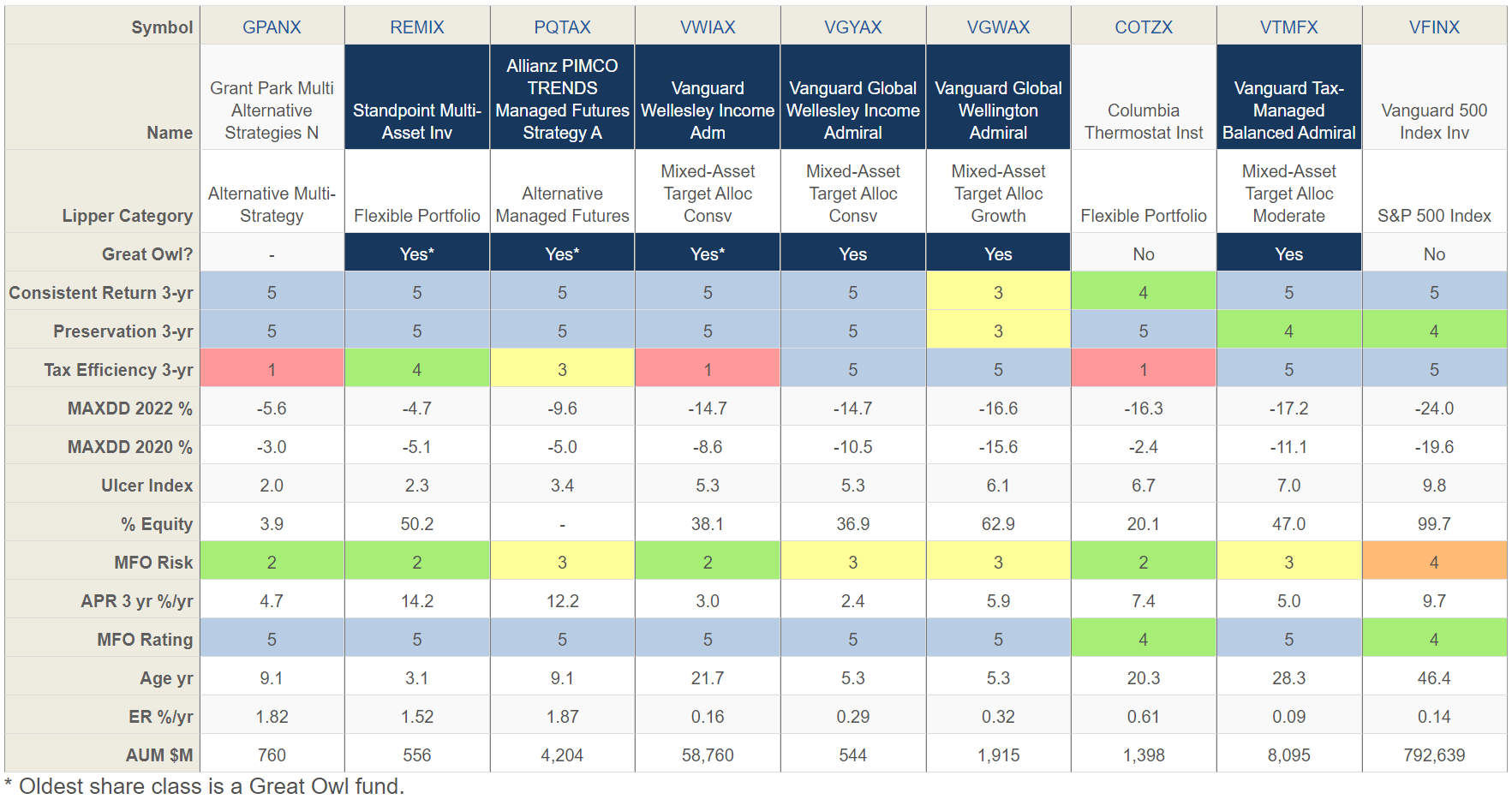 Chart #1 provides a focused summary of the funds. All but Grant Park Multi Alternative Strategies (GPANX) and Columbia Thermostat (COTZX/CTFAX) are classified as MFO Great Owl Funds. The funds are sorted with the lowest risk fund (GPANX) as measured by the Ulcer Index on the left to the highest (VFINX) on the right. All funds are rated as “Best” with an MFO Rating of 5 for Risk Adjusted Performance in their category representing the top quintile except for COTZX, which is rated “4” (Above Average). GPANX and COTZX/CTFAX are the least tax efficient and should be held in tax-advantaged accounts if possible.