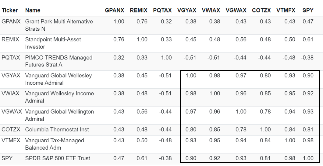 To smooth out volatility, one might seek uncorrelated funds. Chart #10 shows that VGYAX, VWIAX, VGWAX, COTZX, VTMFX, and the S&P 500 (SPY) are the most correlated, with COTZX being slightly less correlated, and one could combine some of these funds if the goal is to keep it simple.
