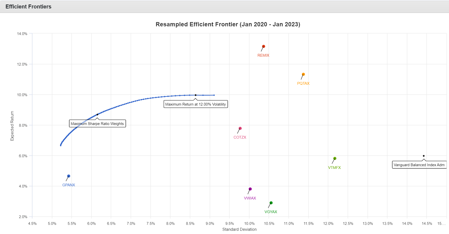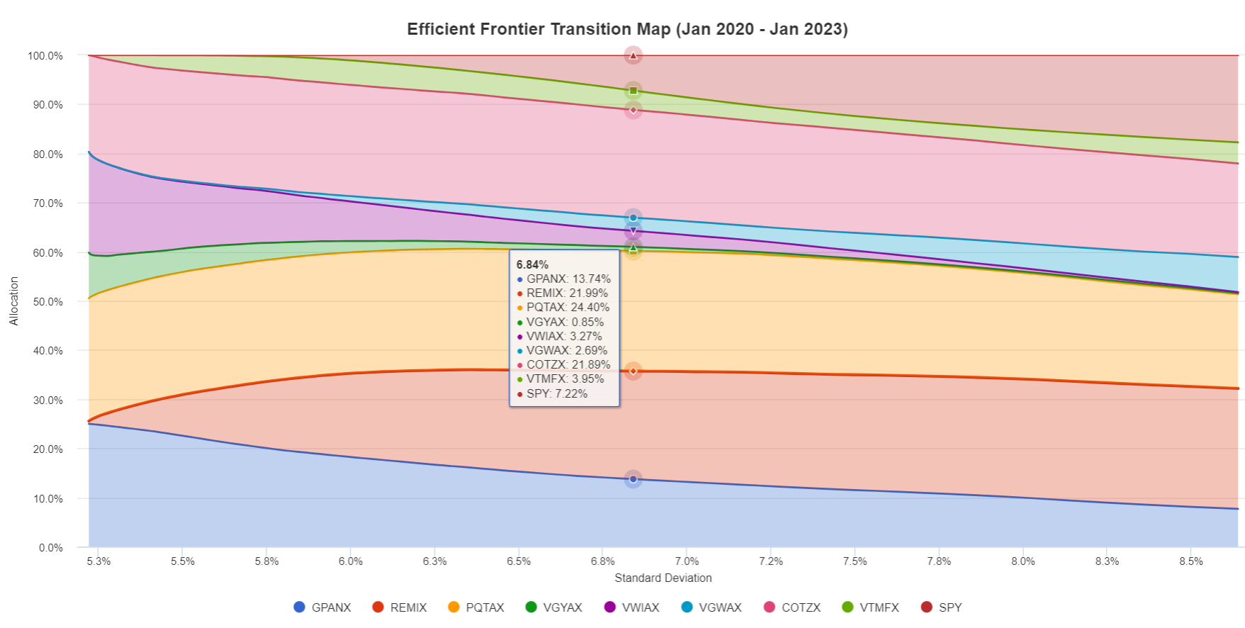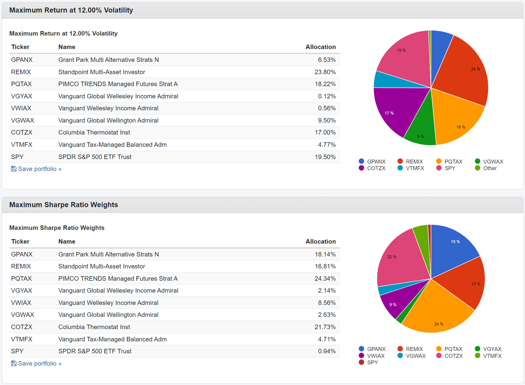 Chart #11 shows the allocations that were used to create the portfolios in Chart #7. In both portfolios, REMIX, PQTAX, and COTZX have high allocations. Also, in both portfolios, VGYAX has the lowest allocations. I have reduced allocations to Vanguard Global Wellington (VGWAX) and increased allocations to the more conservative Vanguard Global Wellesley (VGYAX) because of being more “risk off.”
