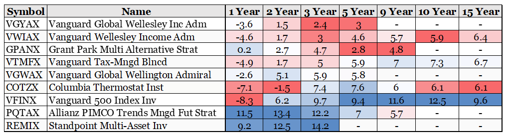 Chart #2 contains the period returns sorted by the lowest three-year return to the highest. During this period, the U.S. economy has experienced the COVID-induced recession, high stimulus, a rapidly rising Fed Funds rate, and last year’s bear market. The next three years will probably be characterized by a recession, falling rates, and quantitative tightening. The next three years favor funds with a high percentage allocated to bonds with longer durations, assuming inflation is contained. This will favor COTZX/CTFAX, VWIAX/VWINX, VGYAX, VTMFX, and VGWAX. Valuations are higher in the U.S., which favors funds with higher international exposure, such as VGYAX, VGWAX, PQTAX, and REMIX. The S&P 500 has benefited from the massive stimulus, low-interest rates, strong dollar, and buybacks over the past decade, which won’t exist in the coming decade. Funds with better long-term performance are VTMFX, COTZX/CTFAX, VWIAX, and PQTAX. Standpoint Multi-Asset (REMIX) is a newer fund with only a three-year history.