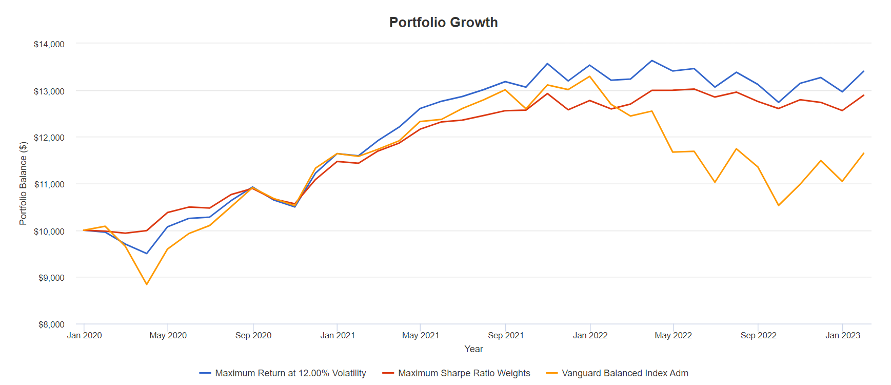 I find the primary strength of Portfolio Visualizer to be optimizing and analyzing allocations for different time periods. The link to Portfolio Visualizer is here. I ran two scenarios to maximize return at 12% volatility (blue line) and to maximize the Sharpe Ratio (red line) using the Vanguard Balance Fund (VBIAX) as a baseline. These two options, along with bonds, are what I am striving for over the next two years – stability with respectable risk-adjusted returns.