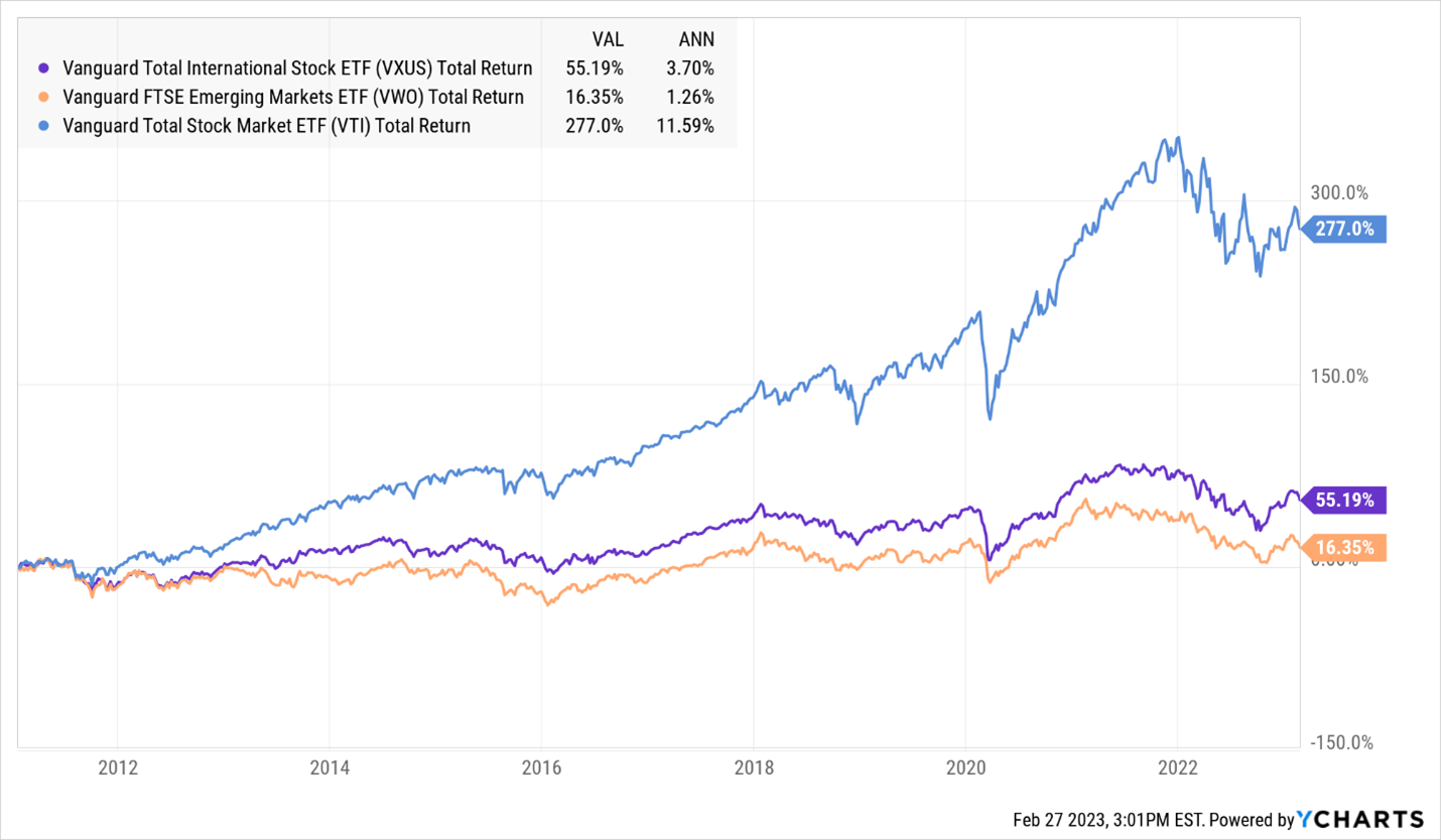 It takes one look at the following chart to determine the basis for his question. From the start of 2009 to Feb-end 2023, U.S. equities measured by the returns of the Vanguard Total Stock Market ETF (VTI) enjoyed a total return of 277%, while the Vanguard International Developed Markets (VXUS) returned 55%, and Vanguard Emerging Markets (VWO) only 16% (or an annualized return of 1%, just 1% a year … a return I would have beaten with a carefully timed investment in a lemonade stand!!). Since that includes dividends, the price returns are even less.