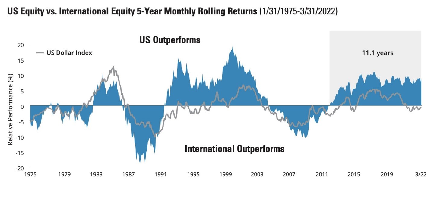 That decade-long lag raises two important perspectives. First, because valuations globally are lower than valuations locally, many capital models project a decade of international outperformance relative to U.S. stocks. Charles Schwab’s capital model, for instance, projects a 150 bps advantage for international large caps over domestic ones with returns of 7.6% versus 6.1% annually. Second, the mere existence of a period of U.S. outperformance is not remarkable. Historically, U.S. and international stocks quite typically trade periods of extended dominance.