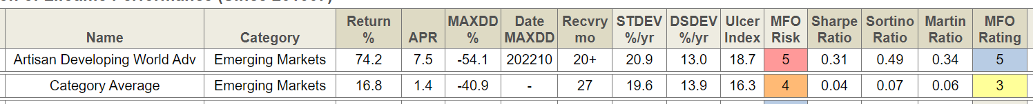 Since its inception, Artisan Developing World has had returns that are 570% of its average peers. The volatility advantage that Thornburg held over its peers has largely disappeared, but the difference in returns is so much greater that Artisan’s Sharpe ratio is almost eight times higher than his peers.