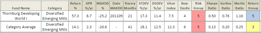 By all of the risk and risk/return measures we follow, he achieved those gains with lower volatility than his peers. Here’s Thornburg under his watch.