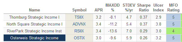 In this issue, we profile two of them. RiverPark Strategic Income, which we first profiled in 2014, is managed by David Sherman of Cohanzick Management. David has a suite of distinguished, high-performing fixed-income funds, which he manages under both the RiverPark and CrossingBridge banners. Osterweis Strategic Income is managed by a team headed by Carl Kaufman, who has been with the fund since its launch. The three-member team boasts 100 years of experience and a very long record of thriving across markets.