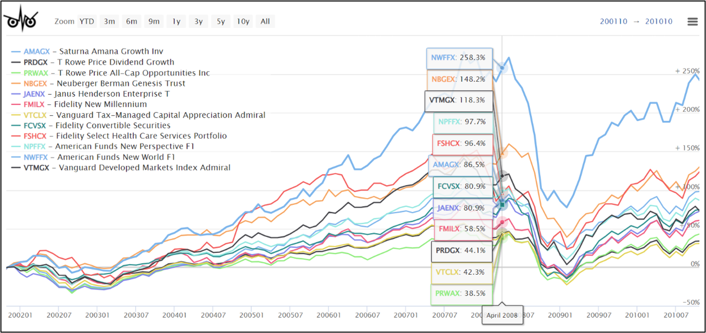 The fund that stands out is American Funds New World (NWFFX), which is an emerging market fund that tends to underweight China with only a 12% allocation. Another fund that I like is the Great Owl Fidelity Actively Managed New Millennium Fund (FMILX and FMIL). I am also inclined toward global and international equity funds because valuations are lower than domestic equity. Growth funds like Saturna Amana Growth (AMAGX), T Rowe Price All-Cap Opportunities (PRWAX), and Fidelity Growth Discovery (FDSVX) will probably do well during the early expansion stage.