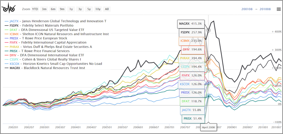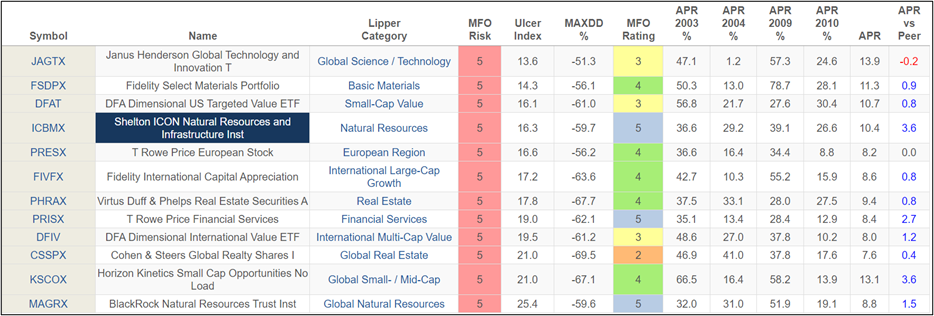 The very aggressive funds (MFO Risk =5) consist mostly of sector funds. They tended to have maximum drawdowns of around 60%. Each recession is different, and these funds need to be evaluated carefully to determine where the opportunities lie. Horizon Kinetics Small Cap Opportunities (KSCOX) catches my attention for its long-term performance; however, it is volatile, so allocations should be relatively small.