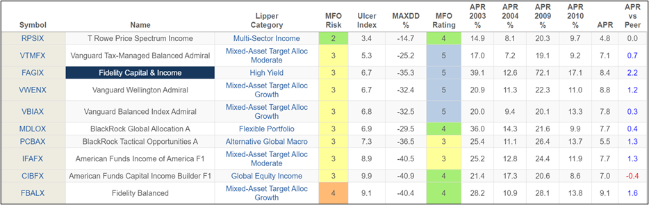 Table #1 contains mostly mixed-asset funds, which will benefit in a falling rate environment. I included the T Rowe Price Spectrum Income (RPSIX) and Fidelity Balanced (FBALX) in this Moderate risk category. The funds generally had maximum drawdowns of 25% to 40% and offer more downside protection than an all-equity fund. I intend to exchange more conservative mixed-asset funds for funds like these as I gain confidence that the economy and markets can see the light of recovery.