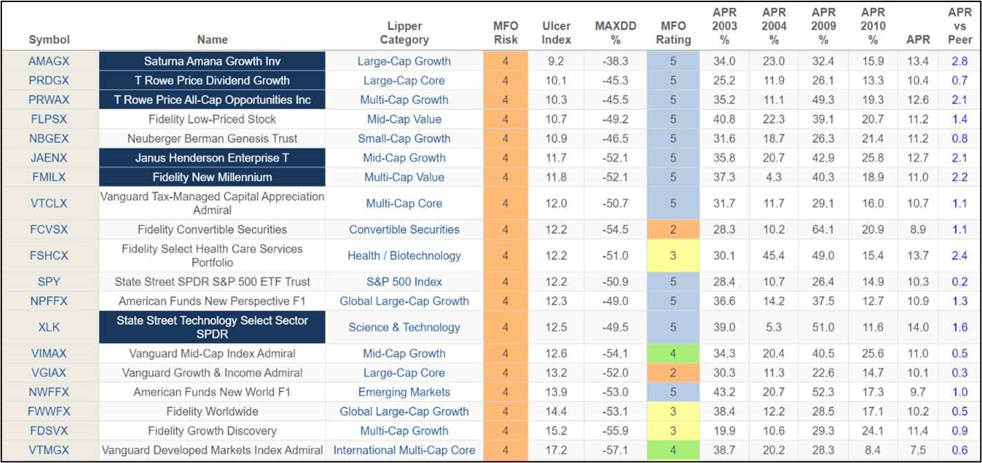 Table #2 contains aggressive funds (MFO Risk =4), which are mostly domestic equity funds with varying market capitalizations. There may also be opportunities in some sector funds, global and international funds, and convertible securities. I expect emerging markets and small cap funds to perform well relative to domestic markets over the next decade.
