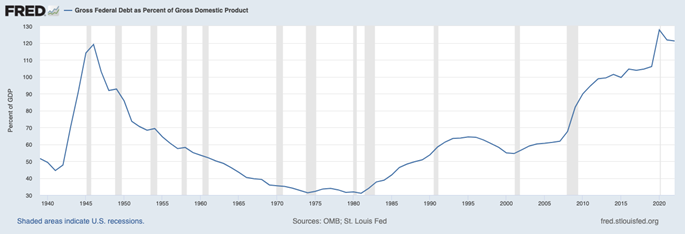 At various points in the Q&A, Buffett brought up the similarity of US debt around WWII and the present time. The picture below shows Gross Public Debt as % of GDP. We are remarkably at the same level of debt to GDP as we were back then – at around 120%. Economists tell us why large and sustained public deficits are not too healthy. Funding those deficits crowds out other investments. As Interest rates rise, investors feel safer in 5% fixed income. Who needs to risk money in an always nerve-wracking stock market?!