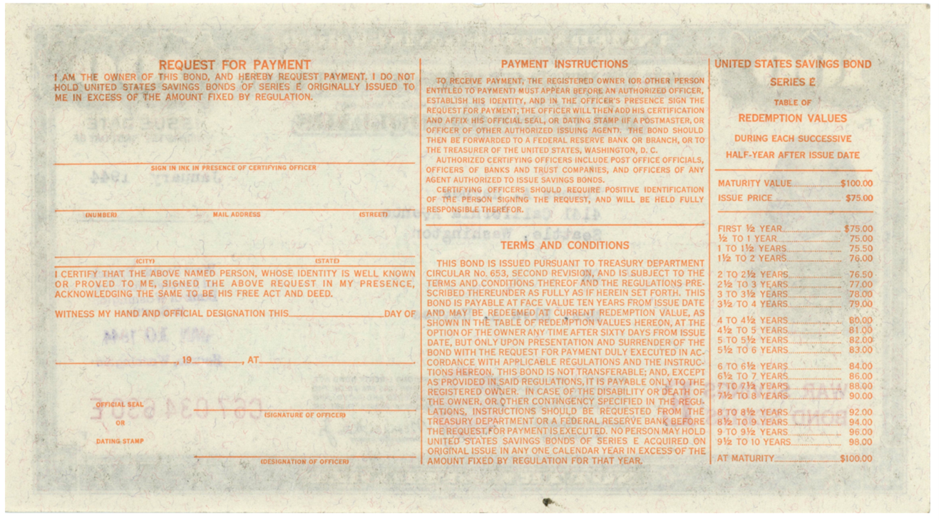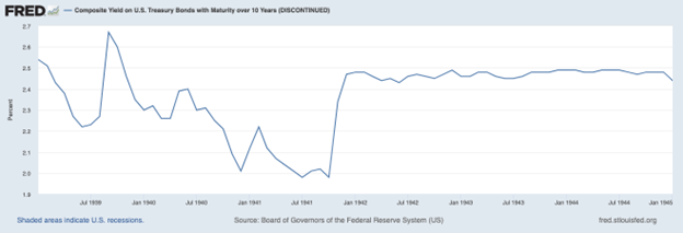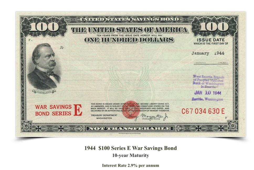 To fund WWII spending, the US federal government needed a lot of money. War Savings bonds was one of the answers. The Joe I. Herbstman Memorial Collection of American Finance has good information on Savings Bonds from 1941 to 2007, along with some history. These bonds were forefathers to our present day Series EE savings bonds. According to the website, “Known originally as Defense Bonds and War Savings Bonds, these securities helped raise some $185 billion for WWII alone. Six million volunteers helped to sell some one billion individual securities for the war effort.” The 1944 War Savings bond apparently had a 10-year Yield to maturity of 2.92% annualized.