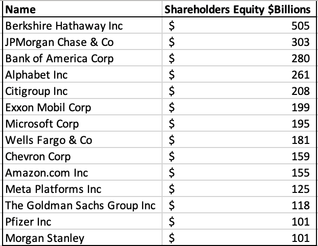 Buffett likes to remind investors that Berkshire’s Shareholders’ Equity is the largest of any American company.