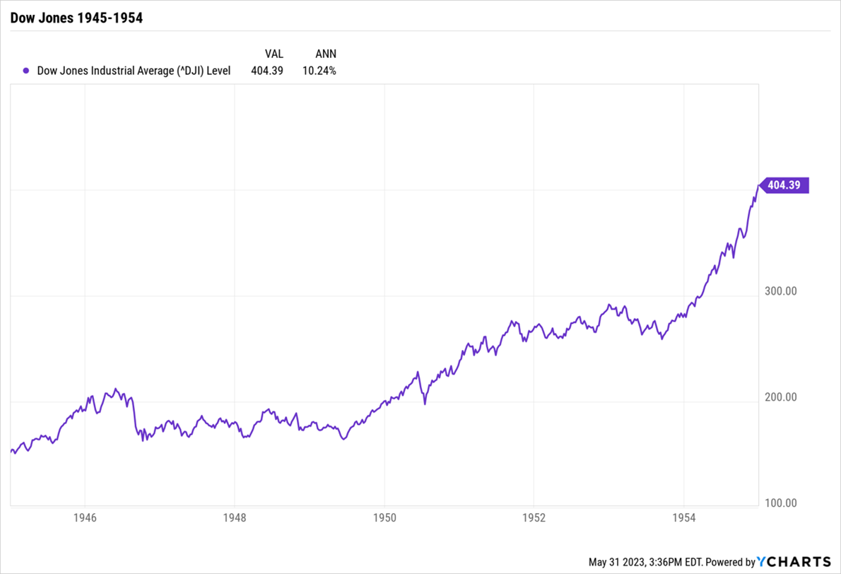 The annualized return on stocks was 10.2% on the Dow Jones Industrials in the years from the start of 1944 to the end of 1954. During the same time, public debt went from 120% of GDP to 70%, War Savings Bonds yielded 2.92%, and inflation clocked at an average 3.9%.