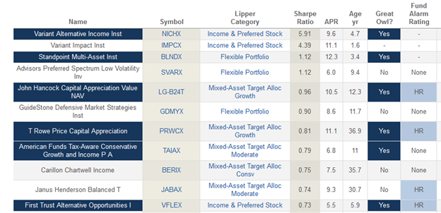 Here’s a screen of all multi-asset funds, sorted by Sharpe ratio. You’ll notice that the first two are closed-end funds that are vastly outperforming the field, the third is a young fund that we’ve profiled, while #4 and 6 are T Rowe Price Cap App and a clone.