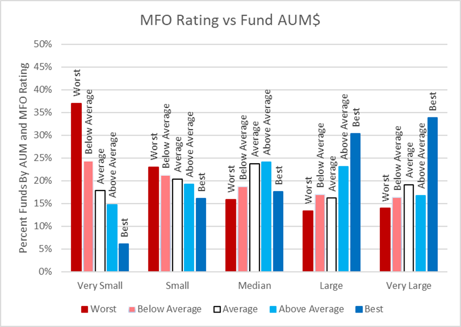 Figure #1 shows the summary results of the MFO Rank for quintile groups of Assets Under Management by Lipper Category. The ratings of the Large and Very Large Funds are skewed to higher risk-adjusted performance while “Very Small” and “Small” funds are skewed to lower risk-adjusted performance.