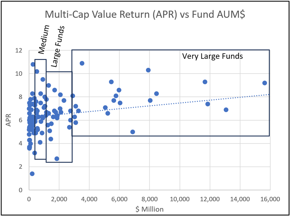 I use the Multi-Cap Value Lipper Category to visually examine the ranges of return and AUM. Outlier high returns for the largest funds are excluded.