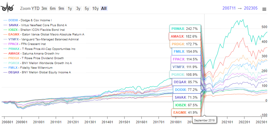 I reviewed the charts of the Great Owls and selected one per Lipper Category as shown in Table #6 above. I described the Vanguard Tax-Managed Balanced Fund (VTMFX) in “Helping a Friend Get Started with Financial Planning” and the FMILX in “Fidelity Actively Managed New Millennium ETF (FMIL)”.
